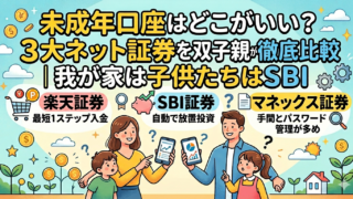 未成年口座、どこがいいか迷っていませんか?双子の親である筆者がSBI・楽天・マネックスを徹底比較。2人分を管理して分かった未成年口座ならではの入金に関する手間や、親の口座から1ステップで入金できる楽天の強み、SBIで投資を完全自動化するほったらかし投資を解説します。