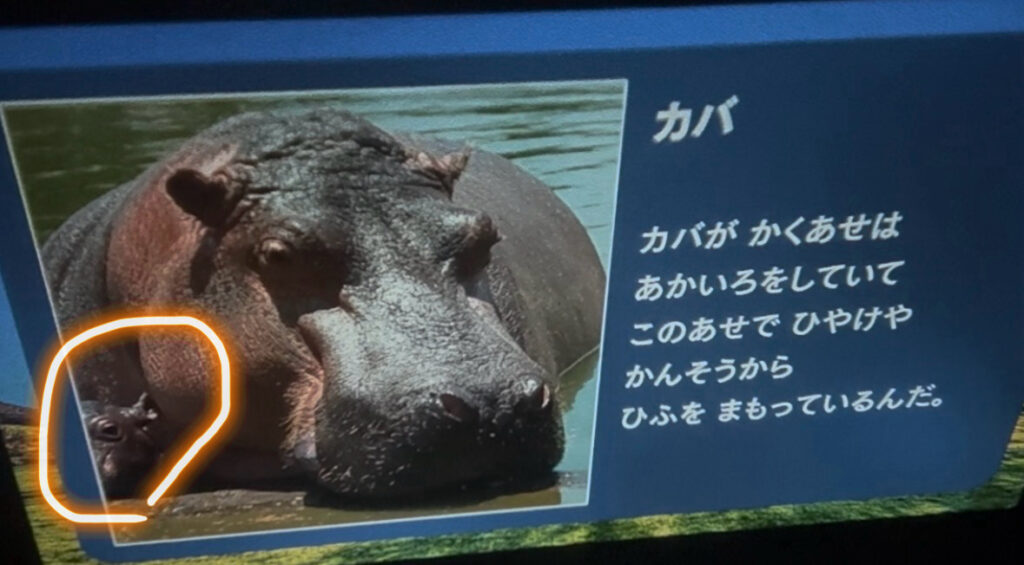 カバの親子が登場するシーンでの出来事です。大人の私は、つい画面中央の大きなカバばかり見ていましたが、子供たちは「あ!こっちいる!こっちいる!」と大興奮。