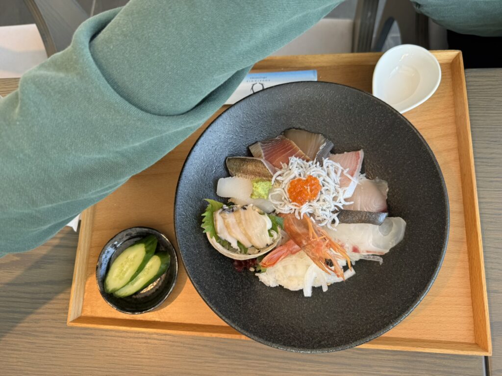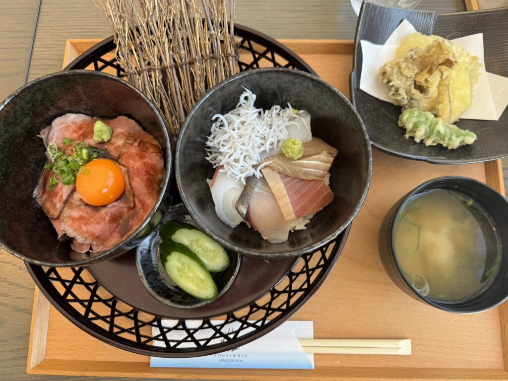 - 大人の贅沢: 私は海鮮丼、妻は淡路牛のローストビーフ丼と海鮮丼がセットになった欲張り定食を堪能。新鮮なお魚や淡路牛をオーシャンビューとともに味わえ、空腹も心も満たされました。