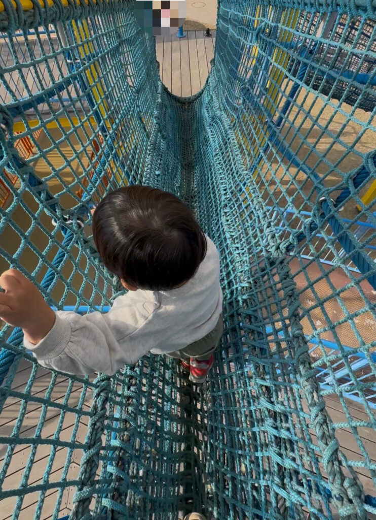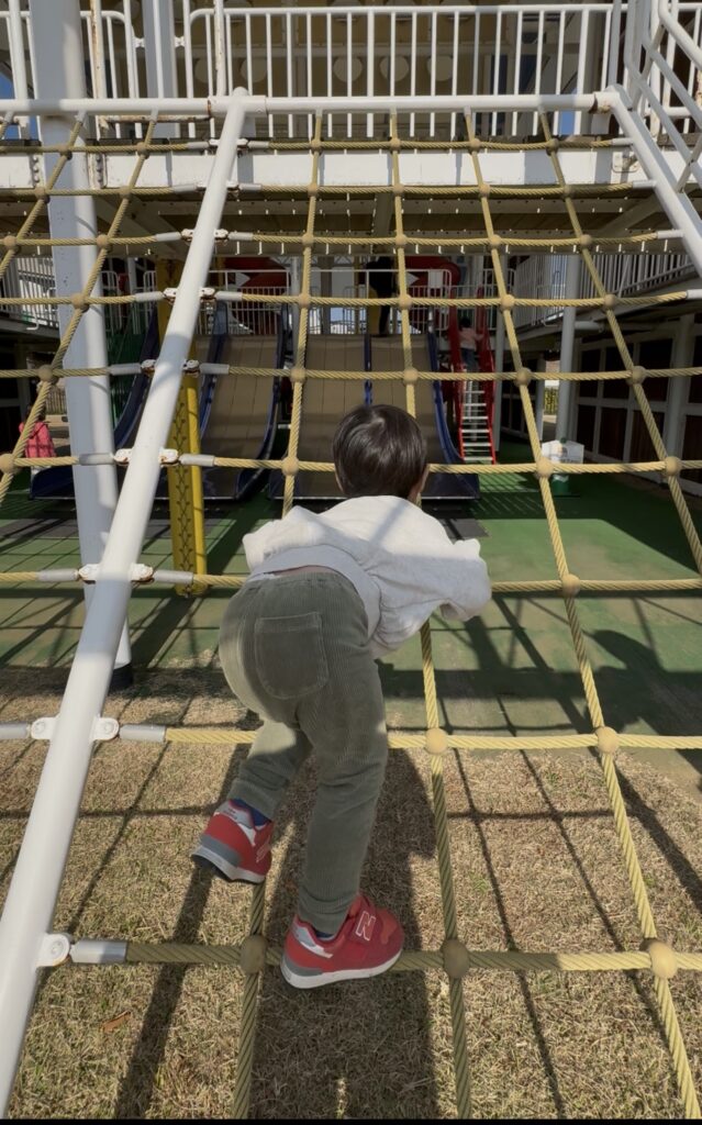 - 縄のクライミング: 程よい斜度と最悪落ちてもフォローできる高さのクライミングウォール。縄または手すりを持ってゆっくり登れば、わが家の2歳児でも最後まで登頂できました!