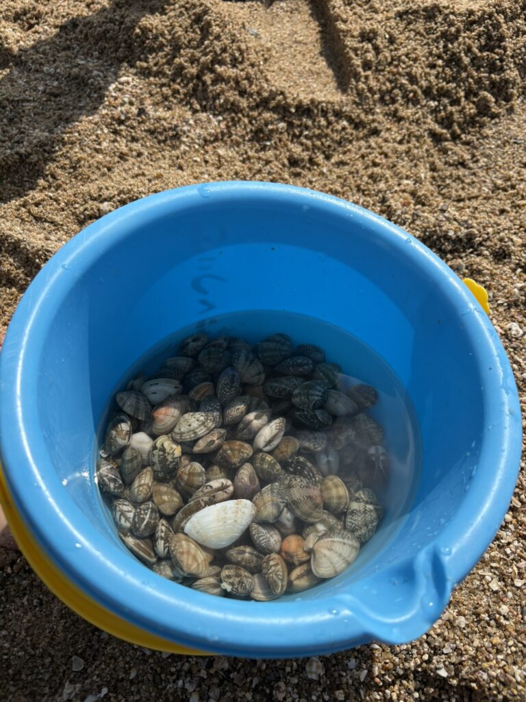 - 砂の下から水が湧き出る: 穴を深く掘り進めると、海まで行かなくても砂の下から海水がじわじわと湧いてきます。無心で潮干狩りしているので当然服はびちょびちょです。