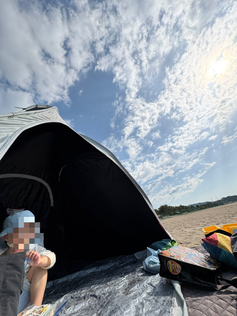 ※補足:本格的な干潟の潮干狩り場だと設営スペースがないかもですが、ぴちぴちビーチのようなレクリエーション要素の強い海水浴場であれば非常に重宝します。またぴちぴちビーチはスタッフに確認した上で持ち込みましたが、ワンタッチであってもテントの持ち込み不可のケースもあるかもなので、あらかじめ確認したうえで持ち込みましょう。