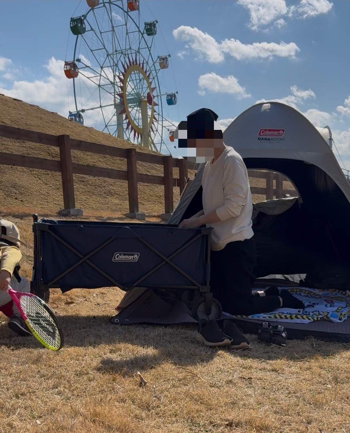 ワンタッチテントがあれば、大規模公園で丸一日遊ぶことが可能になります。私が愛用しているのは日光を90%以上カットするコールマンのポップアップテント。